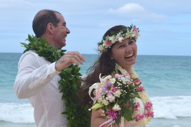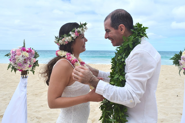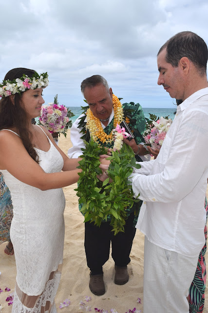 No momento da troca de alianças e dos Leis, o Oficiante, nos explicou que os anéis são símbolos muito antigos nas cerimônias de casamento, um círculo que não tem começo e não tem fim, o círculo da vida, é o amor que se dá e se recebe e significa a vida que escolhemos naquele momento. E desde os tempos antigos, os havaianos não tinham nenhum material para confeccionar algum símbolo, apenas as coisas da natureza como flores e folhas, por isso a tradição dos Leis que assim como os anéis, não tem começo nem fim, suas folhas são trançadas e unidas pelos ramos, o que significa o casamento. Os havaianos acreditam que suas folhas foram pegues na floresta dos Deuses, já o Lei da noiva representa a feminilidade, a beleza da mulher.