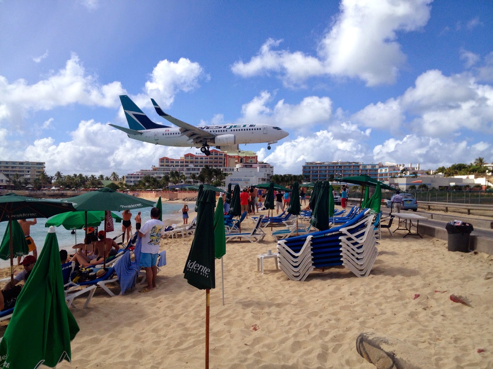 Não tem como ir a Saint Martin e não ver os tais aviões que passam beirando as praias. Como os aviões grandes costumam chegar a partir das 10h ou 11h chegamos cedo e ficamos no Sunset Beach Bar, ideal para petiscar, ver aviões chegando e tirar fotos. Tem uma prancha na areia em frente ao bar informando os horários de voos e aviões todos os dias. Os maiores, da Air France e da American Airlines, chegam apenas nos fins de semana.